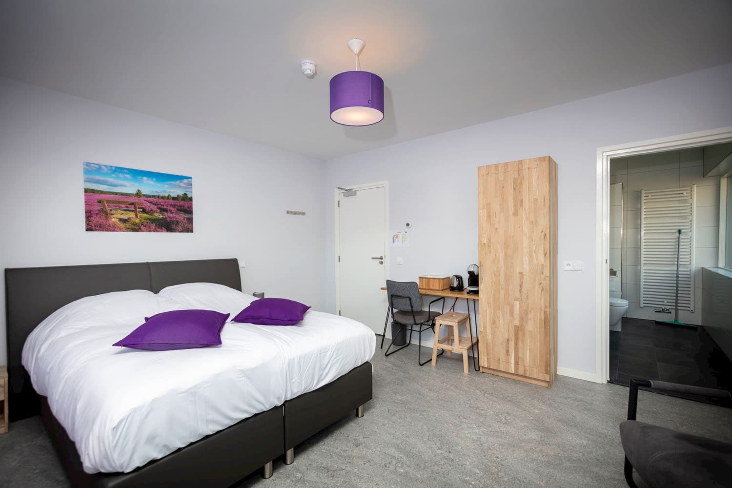 Ruime kamer (19 m2) en badkamer (6 m2), beide met vloerverwarming. Deze kamer is op de begane grond dus ook geschikt voor mindervalide mensen. Zo is er ruimte in de kamer en badkamer om met een rollator te kunnen lopen. De inloopdouche is voldoende groot om een douchestoel te plaatsen (zie service). Door de extra slaapbank (1,40 breed, lattenbodem) is de kamer ook als familiekamer te gebruiken.